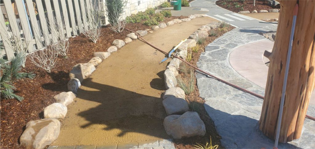 As the designer and builder of the project, JONESPLAN was able to approach the project with flexibility and responsiveness to on-site challenges, ensuring that the design vision was effectively translated into the built environment. This integrated approach ensured that creative solutions were practical and achievable.The construction process was managed and executed by JONESPLAN. The decision to self-perform all work, rather than subcontracting, allowed for greater control over the project’s timeline and budget. Dan Sinnett from JONESPLAN noted that this approach facilitated a more integrated and cohesive execution.Minick Materials provided on-site support for the stabilized aggregate portion of the project, including material delivery and hands-on troubleshooting to ensure success. The OLSA was delivered pre-mixed with water to streamline the installation process, ensuring proper hydration level and consistency and reducing potential errors.Transitions between varying surface material types were a focus-point of the installation. Different material types, edge conditions, and site geometry necessitated a detail-oriented approach to the installation. For the OLSA, that meant compaction using a hand-tamper in areas where access with a roller was not possible.