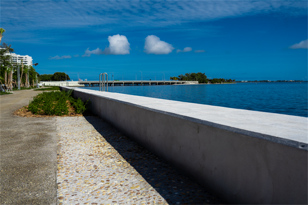 Resilience and DurabilityGiven the park's coastal location and exposure to severe weather, creating a resilient and durable landscape was crucial. The design needed to withstand hurricanes, tropical storms, and tidal flooding. The main design component increasing resilience was the raised seawall – elevated by almost four feet in height across a shoreline length of 1125 feet.