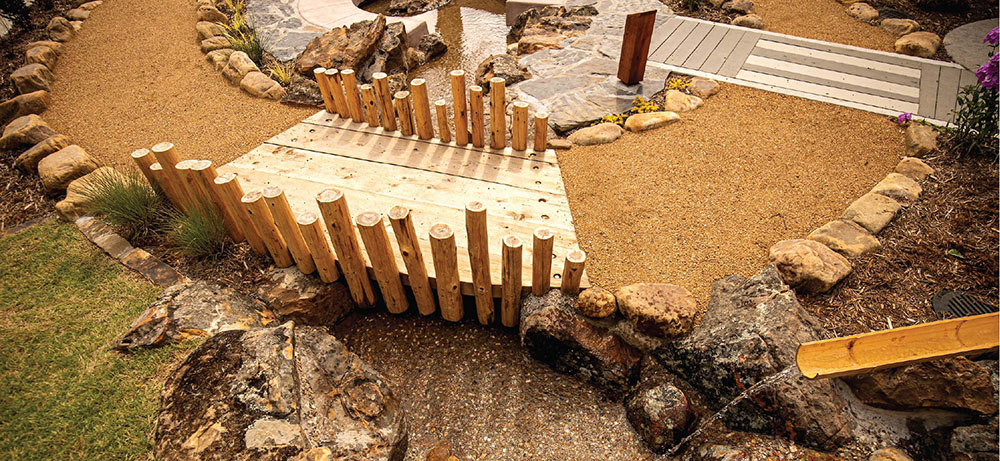 Natural materials were selected throughout, including wooden fencing, solid wood slab bridges, rocky dry creeks with mortared river rock, and a willow branch tunnel.