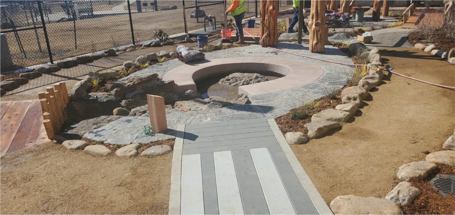 2- Water Play Feature Integration: The water play areas posed additional challenges, necessitating the use of Organic-Lock stabilized aggregate, as opposed to unstabilized aggregate, to reduce erosion and maintain a stable surface in adjacent areas. The design also features permeable pavers directly around the water features to manage water flow.