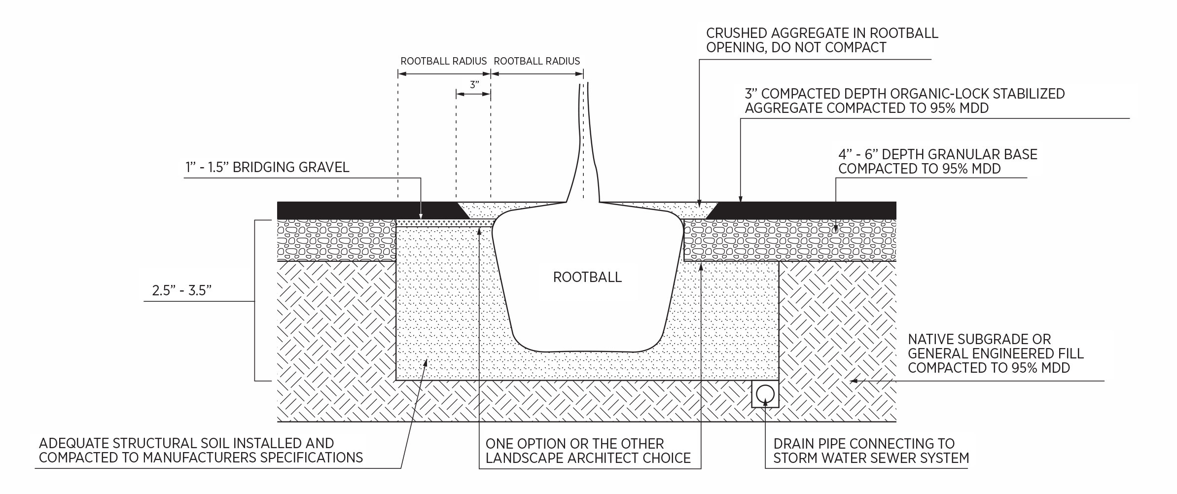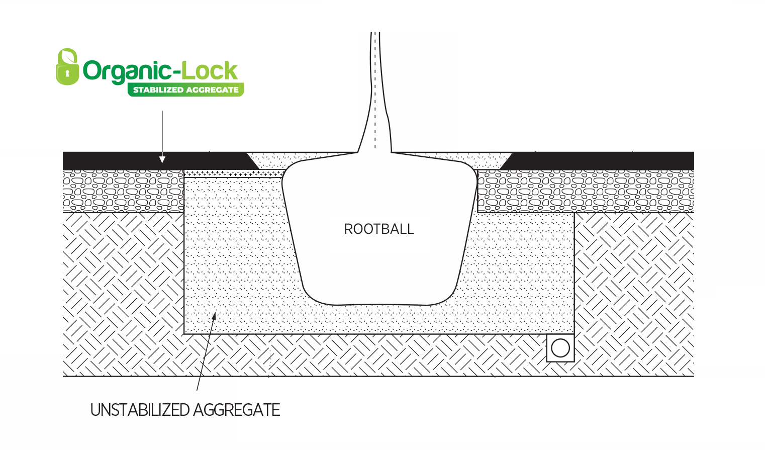 It is recommended to use a Structural Soil blend when installing a surface material intended for traffic up to the trunk of the tree. Installing Structural Soil is recommended below the root base and out to the radius of the root ball (even extending up to 12′ for more sensitive trees). Install the Structural Soil in lieu of the base material (at the same depth) and then proceed with the Organic-Lock™ Stabilized Aggregate mix over the surface of the compacted structural soil. Options (lowest to highest rates of permeability):