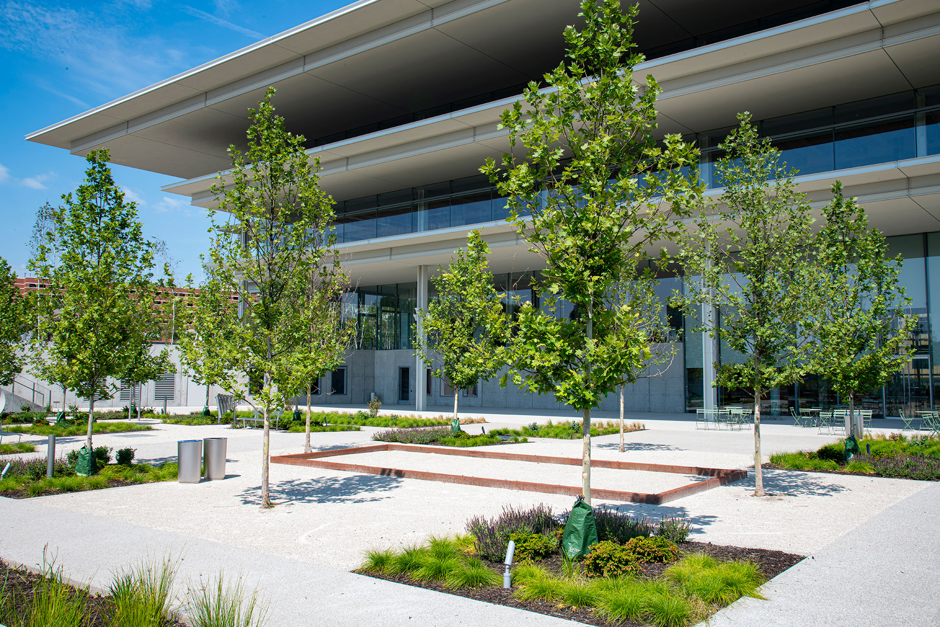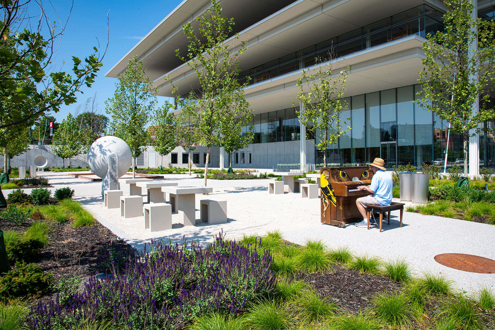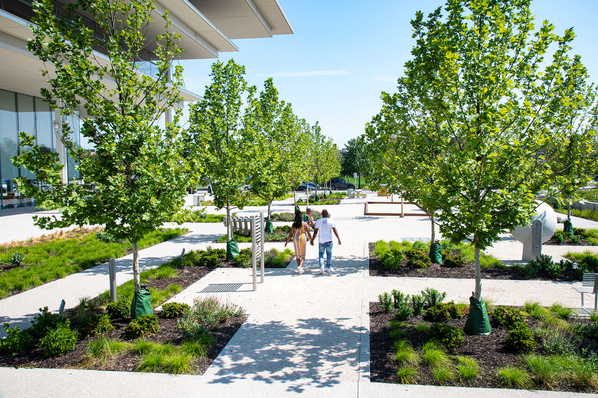 The Krause Gateway Center in downtown Des Moines is a corporate headquarters with a prominent urban plaza designed by OLIN. Opened in 2018 adjacent to a sculpture park, the plaza seamlessly merges architecture and landscape. Organic-Lock Stabilized Aggregate was utilized for pedestrian pathways and terrace areas, contributing a warm, natural texture amid the modern building and art. The OLSA pathways provide durable, accessible surfaces that remain water-permeable to reduce runoff.
