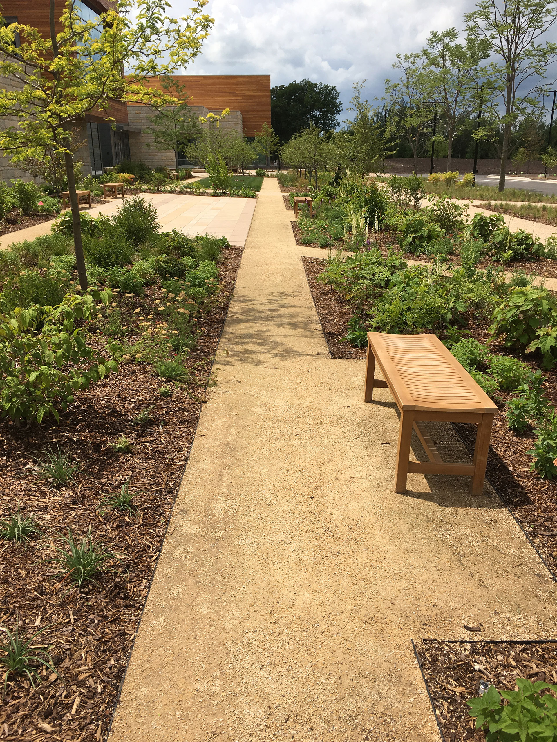 Grande Cheese Company’s headquarters includes a campus-style landscape reflecting rural Wisconsin heritage. As part of site development around 2016, Organic-Lock Stabilized Aggregate was chosen for employee walkways and an outdoor courtyard. The paths link the main building to a pond and prairie plantings, evoking a farm lane aesthetic while providing permeability and year-round usability.